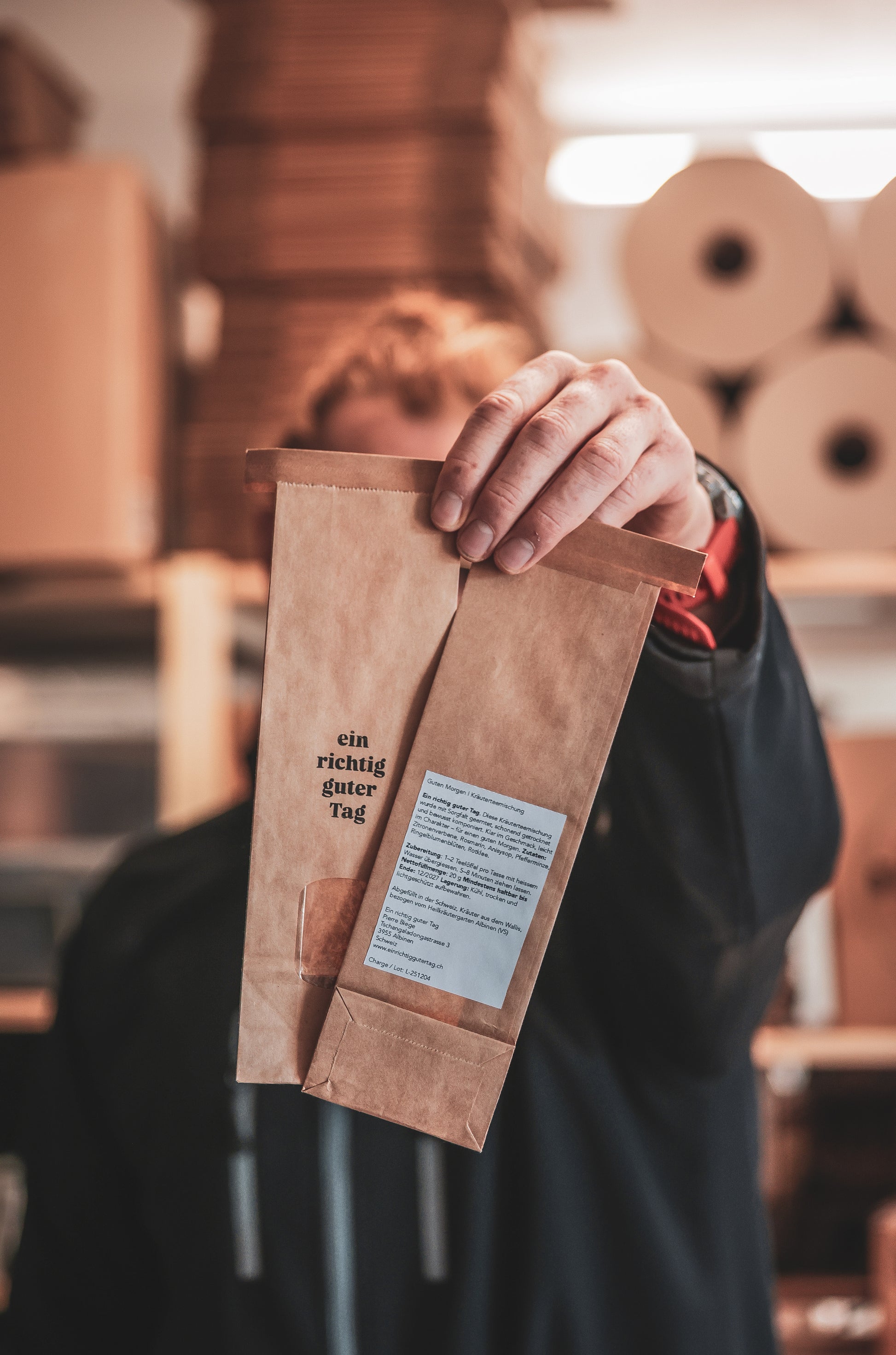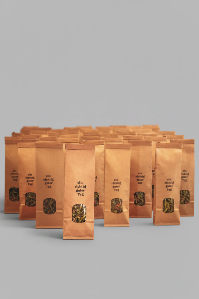 Der Tee wird in kleinen Chargen in der Schweiz von Hand abgefüllt. Verpackt in schlichten Papiersäckchen, die den Inhalt gut schützen und sich leicht recyceln lassen.