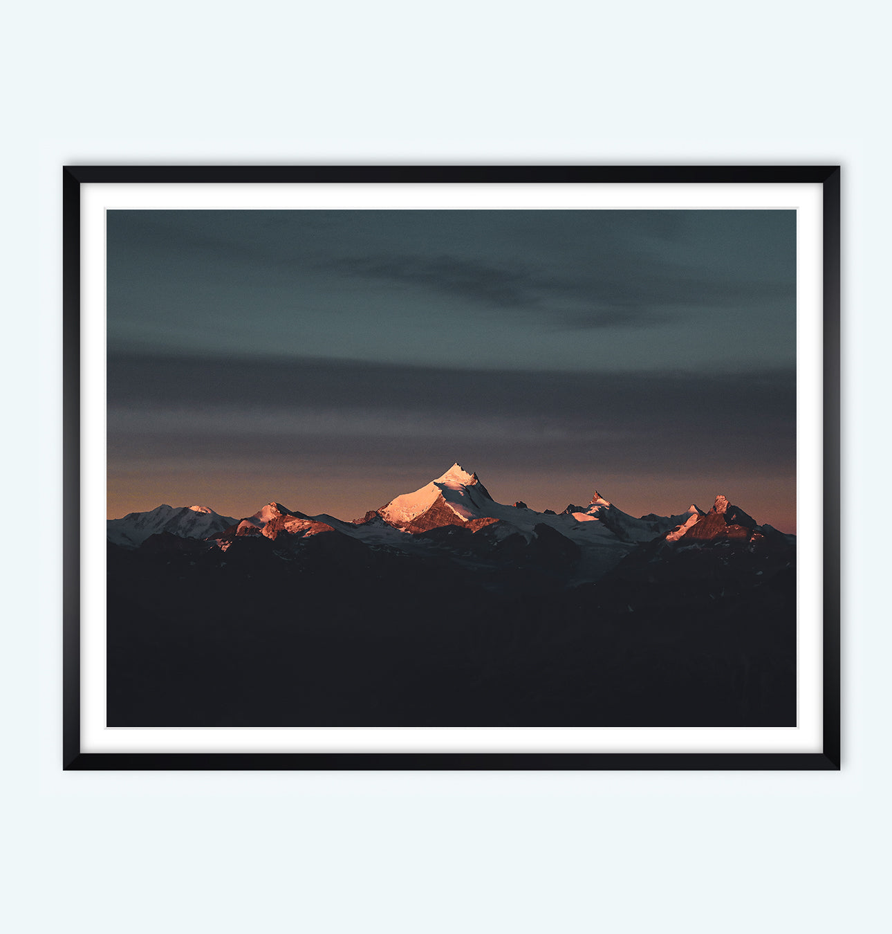 Dieser Fine Art Print zeigt die majestätische 4000er-Kette in ihrer ganzen Pracht – als tägliche Erinnerung daran, dass die besten Aussichten nur die erreichen, die den Weg nach oben nicht scheuen.